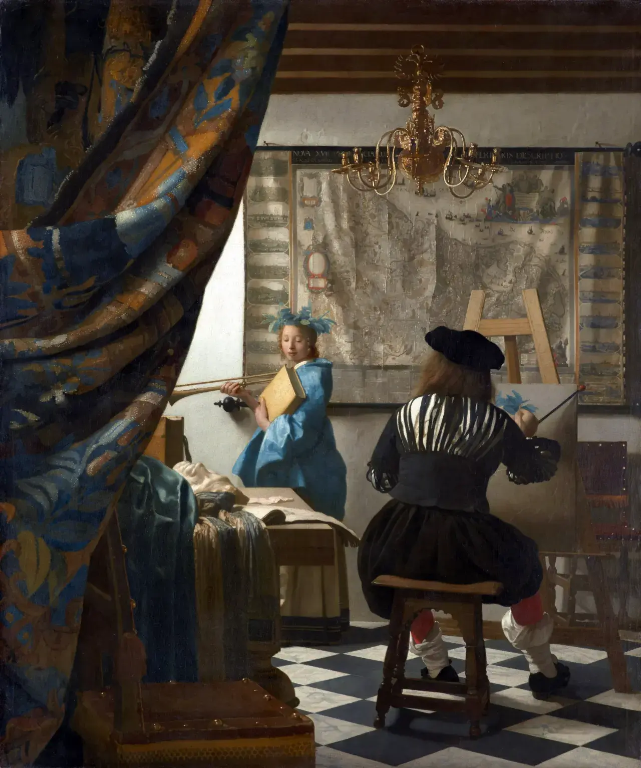 Вермеер изобразил себя... со спины. Художник сидит за мольбертом, но его лица не видно. Этот приём делает нас соучастниками: он будто отодвигает тяжёлую занавесь (символическую границу между мирами) и приглашает в святая святых — свою мастерскую.