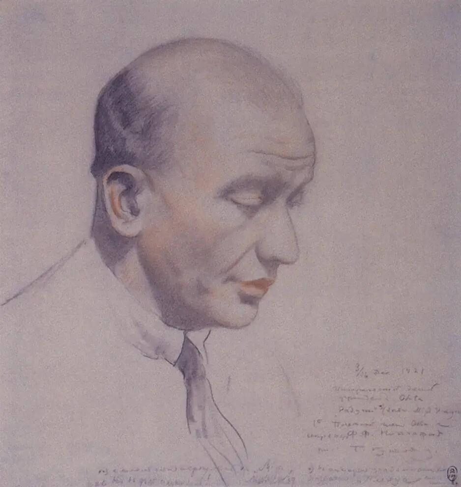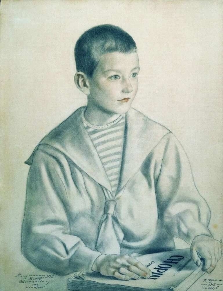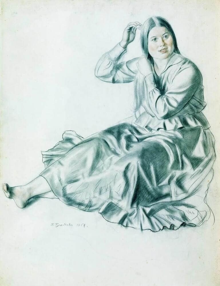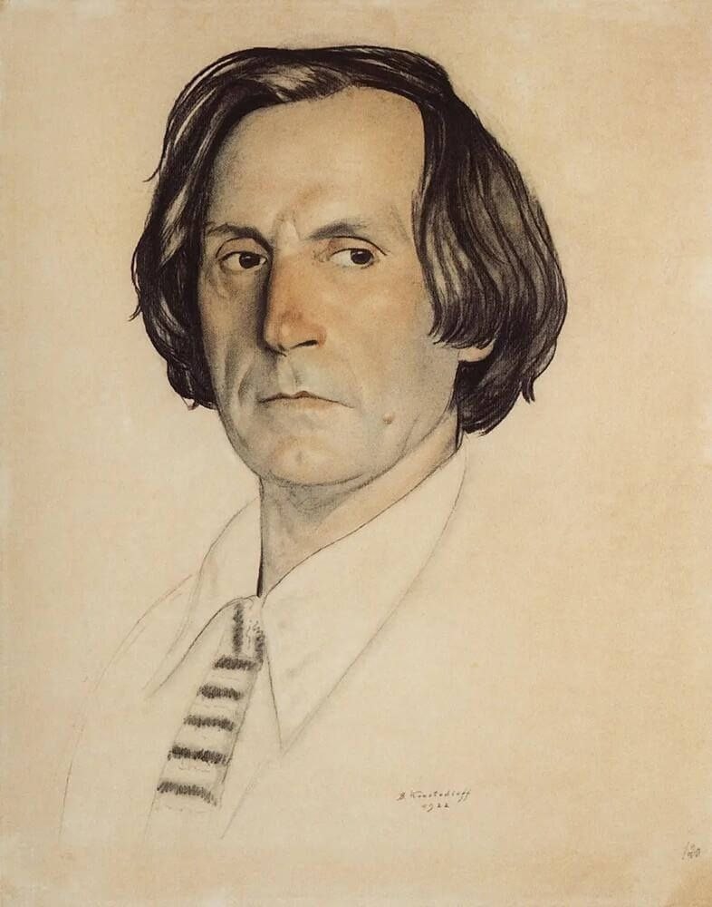 Портреты: Несмотря на любовь к жанровым сценам, он был блестящим портретистом. Его портреты очень разные: от изысканного «Портрета Шаляпина» (где певец изображен на фоне типичной кустодиевской масленицы) до более интимных и психологических портретов близких.