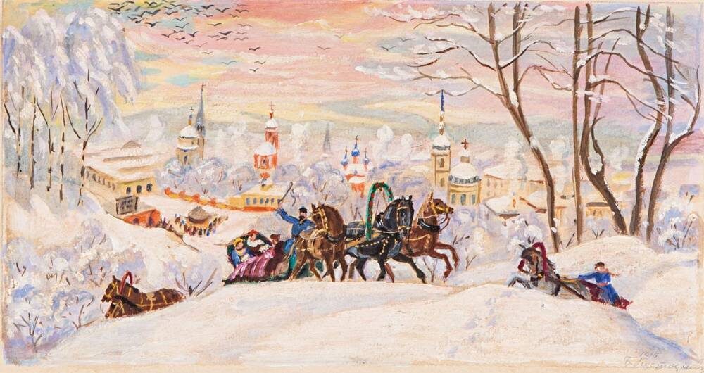 «Масленица» 1916 (есть несколько вариантов) — визитная карточка художника. Заснеженный город, мчащиеся тройки, карусели, ярмарка и золотые купола церквей на фоне розовеющего неба.