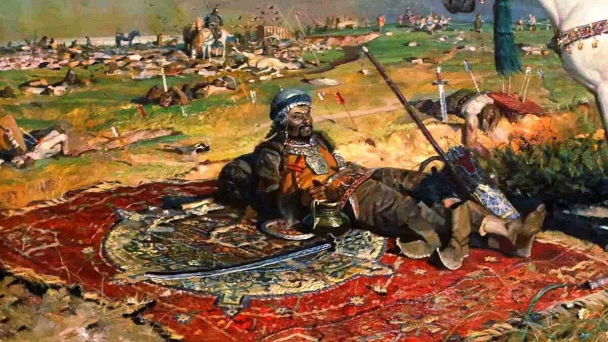 Контраст между гордым князем и самодовольными завоевателями подчеркивается художником и другими символическими деталями. В левом нижнем углу полотна мы видим полководца-язычника, который возлежит на ковре среди трупов с глумливым выражением лица . Его торжествующий смех — это смех над поруганной верой и униженным противником